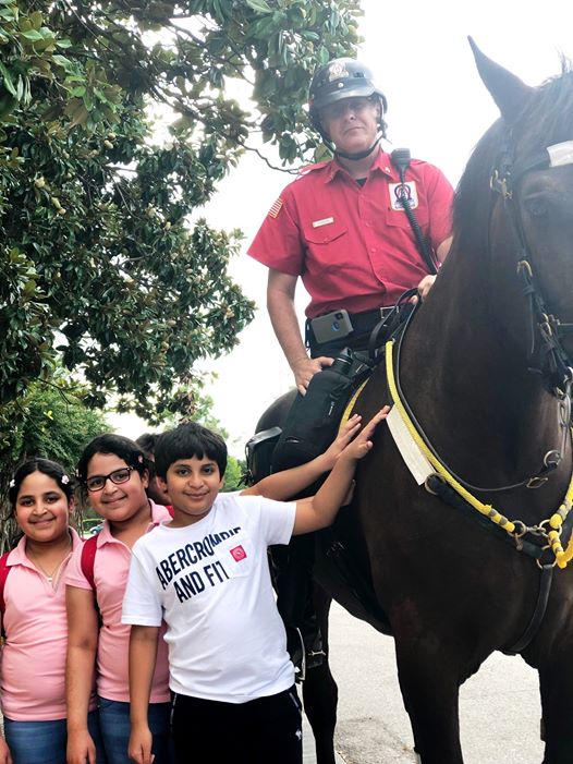 An everyday occurrence since our beginning in 1995, and always encouraged by our riders, is a request to pet the horses. It gives us an opportunity to engage with the children and teach them safety protocols when around horses. The pettings often come with a photo request. We’ve kept track of these interactions over the years and estimate more than a million people have petted an A&O horse during our 35 years of public safety service.