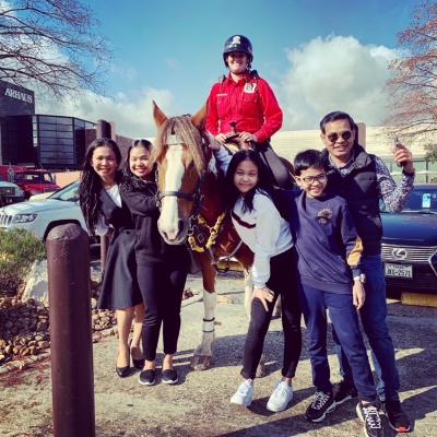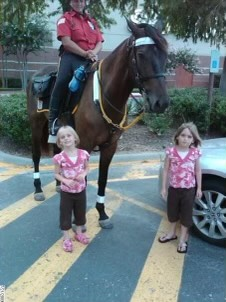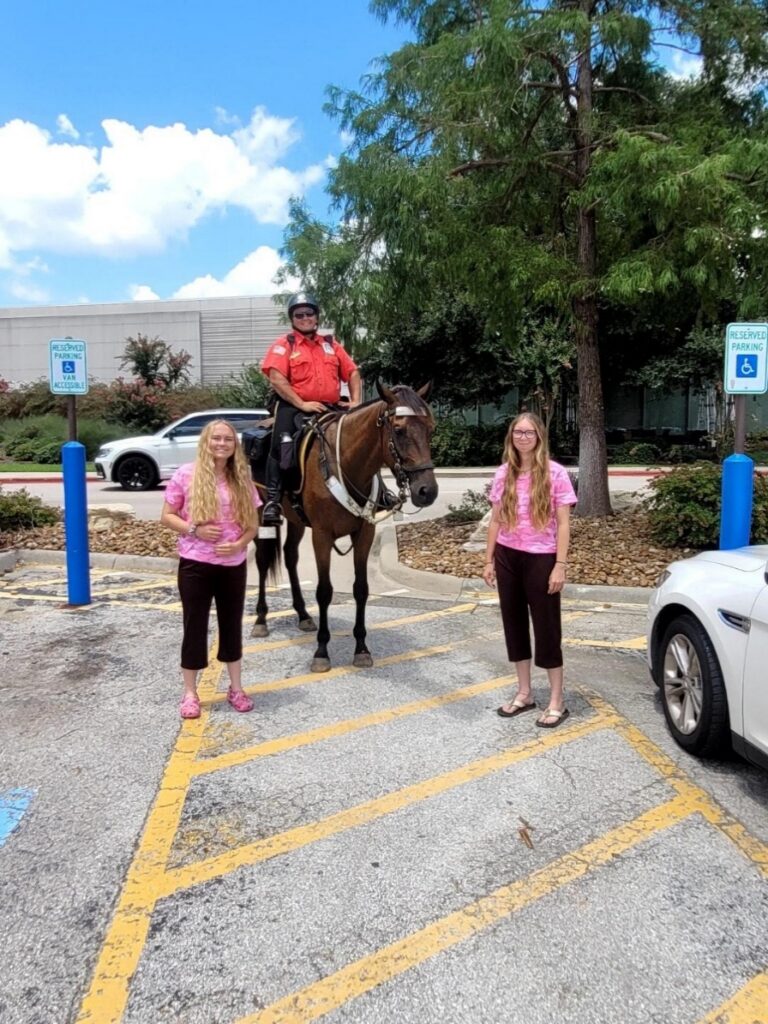 Perhaps the most delightful story of how much kids become attached to the Troopers is that of the 6-year old Higgins twins who grew up to be A&O Troopers. When the girls were young, they frequently came to The Woodlands Mall with their mother and grandmother, mainly to ride the carousel and see the horses. They, like most of the kids, wanted to pet the horses and have a photo taken. Already accomplished riders from age 8, the girls got their own horses in their teens. Kendall got Phoenix who later became her highly trained mounted patrol horse. She reports that “collecting stray shopping carts and meeting all the little kids“ is Phoenix’s favorite part of each day. For Kendall, it’s the concerts.