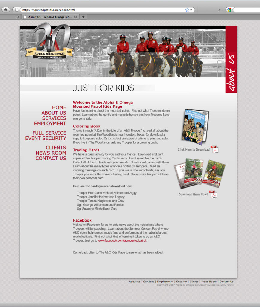 In 2005 with the advancement of kids using social media, A&O added a special kids page to our website. We wanted to introduce our activities for children to a wider audience and make some of our giveaways available to children anywhere in the world. At any time now children can download the coloring book or just one of its pages. They can access Trooper trading cards and get information about kids events.
